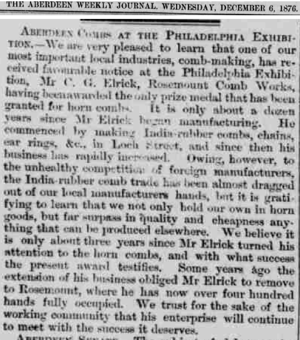 We are very pleased to learn that one of our most important local Industries, comb-making has received favourable notice at the Philadelphia exhibition, Mr. C.G Elrick, Rosemount Comb Works, having been awarded the only prize medal that has been granted for horn combs. It is only about a dozen years since Mr Elrick began manufacturing. He commenced by making India-rubber combs, chains, ear rings etc in Loch Street, and since then his business has rapidly increased. Owing, however, to the unhealthy competition of foreign manufacturers, the India-rubber comb trade has been almost dragged out of our local manufacturers hands, but it is gratifying to learn that we not only hold our own in horn goods, but far surpass in quality and cheapness anything that can be produced elsewhere. We believe it is only about three years since Mr Elrick turned his attention to the horn combs, and with what success the present award testifies. Some years ago the extension of his business obliged Mr Elrick to remove to Rosemount, where he has now over 400 hands fully occupied. We trust for the sake of the working community that his enterprise will continue to meet with the success it deserves.