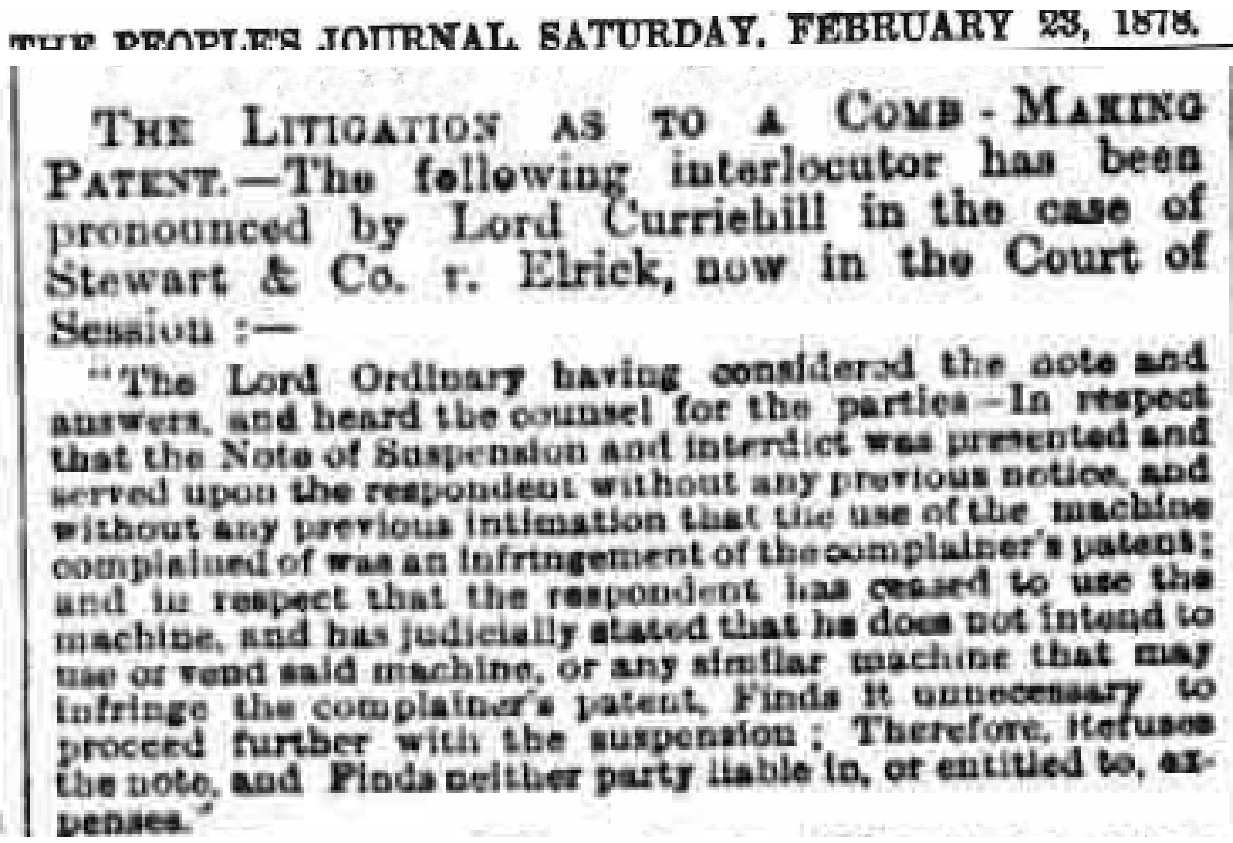 “The Lord ordinary having considered the note and answers, and heard the counsel for both parties – In respect that the Note of Suspension and interdict was presented and served upon the respondent without any previous notice and without any previous intimation that the use of the machine complained of was an infringement of the complainer’s patent ; and in respect that the respondent has ceased to use the machine, and has judicially stated that he does not intend to use or vend said machine, or any similar machine that may infringe the complainer’s patent, finds it necessary to proceed further with the suspension ; Therefore refuses the note and Finds neither party liable in, or entitled to, expenses.”