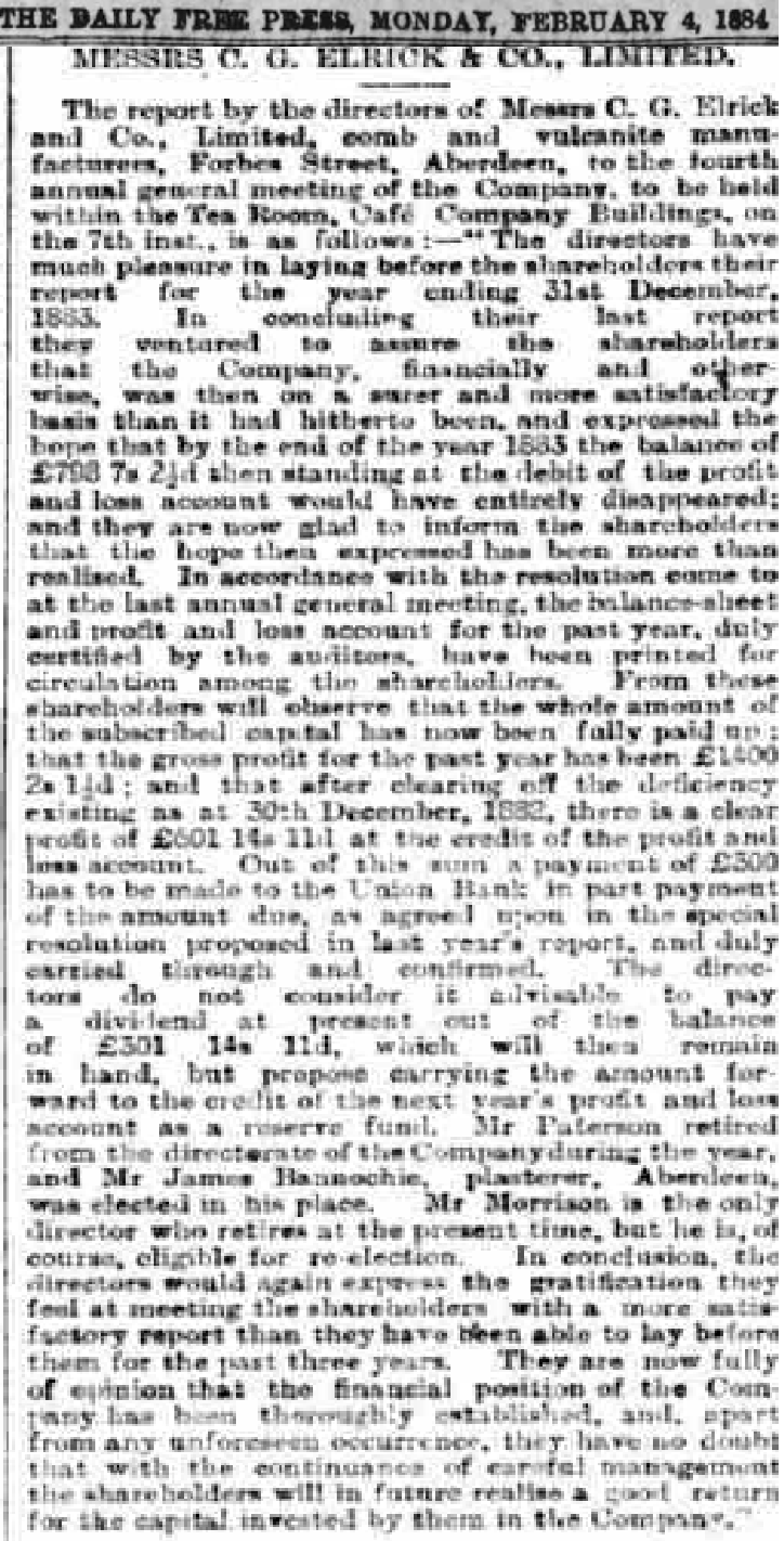 The report by the directors of Messrs C.G Elrick & Co Limited,  comb and vulcanite manufacturers,  Forbes Street, Aberdeen, to the fourth annual general meeting of the company, to be held within the Tea Room, Café Company Buildings, on the 7th , is as follows :-