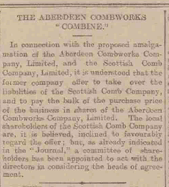 In connection with the proposed amalgamation of the Aberdeen Combworks Company, Limited, and the Scottish Comb Company, Limited, it is understood that the former company offer to take over the liabilities of the Scottish Comb Company, and to pay the bulk of the purchase price of the business in shares of the Aberdeen Combworks Gumpany, Limited. The local shareholders of the Scottish Comb Company are, it is believed, inclined to favourably regard the offer; but, as already indicated in the “Journal,” a committee of shareholders has been appointed to act with the Directors in considering the heads of agreement.