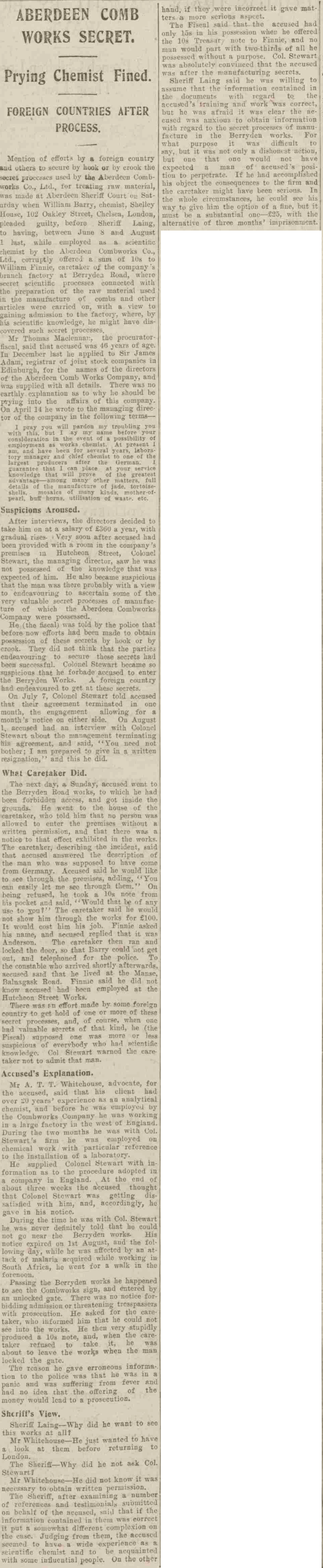 Mention of efforts by a foreign country and others to secure by hook or by crook the secret processes used by the Aberdeen Combworks Co., Ltd, for treating raw material, was made at Aberdeen Sheriff Court on Saturday, when William Barry, chemist, Shelley House, 102 Oakley Street, Chelsea, London, pleaded guilty, before Sheriff Laing, to having, between June 8 and August 1 last, while employed as a scientific chemist by the Aberdeen Combworks Co., Ltd., Corruptly offered a sum of 10 shillings to William Finnie, caretaker of the company’s branch factory at Berryden Road, where secret scientific processes connected with the preparation of the raw material used in the manufacturer of combs and other articles were carried on, with a view to gaining admission to the factory, where, by his scientific knowledge, he might have discovered such secret processes.