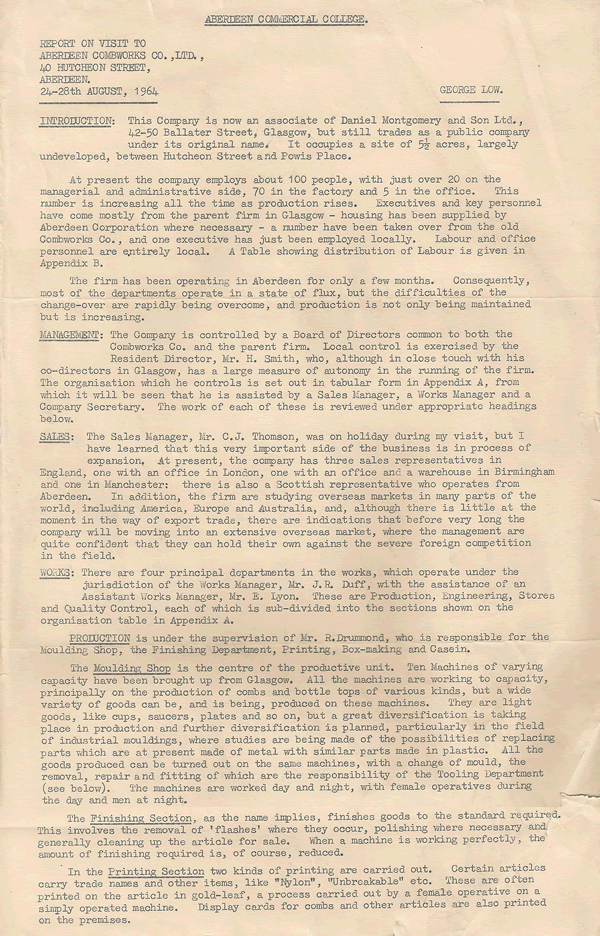 1964 Aberdeen Commercial College report on Aberdeen Combworks Company LtdAberdeen Commercial College- Report on visit to Aberdeen Combworks Company Ltd- Page 1Aberdeen Commercial College- Report on visit to Aberdeen Combworks Company Ltd- Page 2Aberdeen Commercial College- Report on visit to Aberdeen Combworks Company Ltd- Page 3Hugh Smith2024-07-22T19:35:13+01:00July 5th, 2013|Categories: Historical Documents, Reports|Tags: Aberdeen Combworks Company Ltd, Aberdeen Commercial College, Report|0 Comments About the Author: Hugh Smith Related Posts 1845 – 1923 Charles Niven Biographical Entry 1845 – 1923 Charles Niven Biographical Entry 1865 – 1954 Mary Niven (Ms Stewart) Biographical entry 1865 – 1954 Mary Niven (Ms Stewart) Biographical entry 1872 – 1923 George Irvin Thomson Stewart – Biographical entry 1872 – 1923 George Irvin Thomson Stewart – Biographical entry 1833 A Competitor 1833 A Competitor 1897 The Aberdeen Combworks Golf Club 1897 The Aberdeen Combworks Golf Club Leave A Comment Cancel replyComment