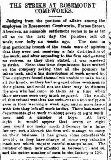 Judging from the position of affairs among the employees and Rosemount Combworks, Forbes Street, Aberdeen, as amicable settlement seems to be as far off as on the first day the pointers left off work, now fully six weeks ago. The men in that particular branch of the trade were of opinion that they were not receiving a fair distribution of the work, and after appealing to the firm and getting no regress, as they then stated, it was resolved to strike. Since that time deputations have waited on the company making that all the pointers be taken back, and a fair distribution of work agreed on. The employers found themselves unable to take back all the hands, as they had engaged other workmen in their places, and could not see their way to dismiss the man who had come to them at a time when their services were very much required. The result of this refusal was that the twin cutters and strippers gave in their warning a week ago, and in accordance with this they left off work today. These last-manned departments give work to about seven or eight men and a number of boys. At first sight it would appear that seven or eight men could not make much difference to a large factory, but although the firm will manage to carry on their business, it has given some considerable trouble, as they have charge of some very valuable machines which require careful manipulation. The number of men now affected is between 25 and 30, and the entire number of men in the factory is 150.